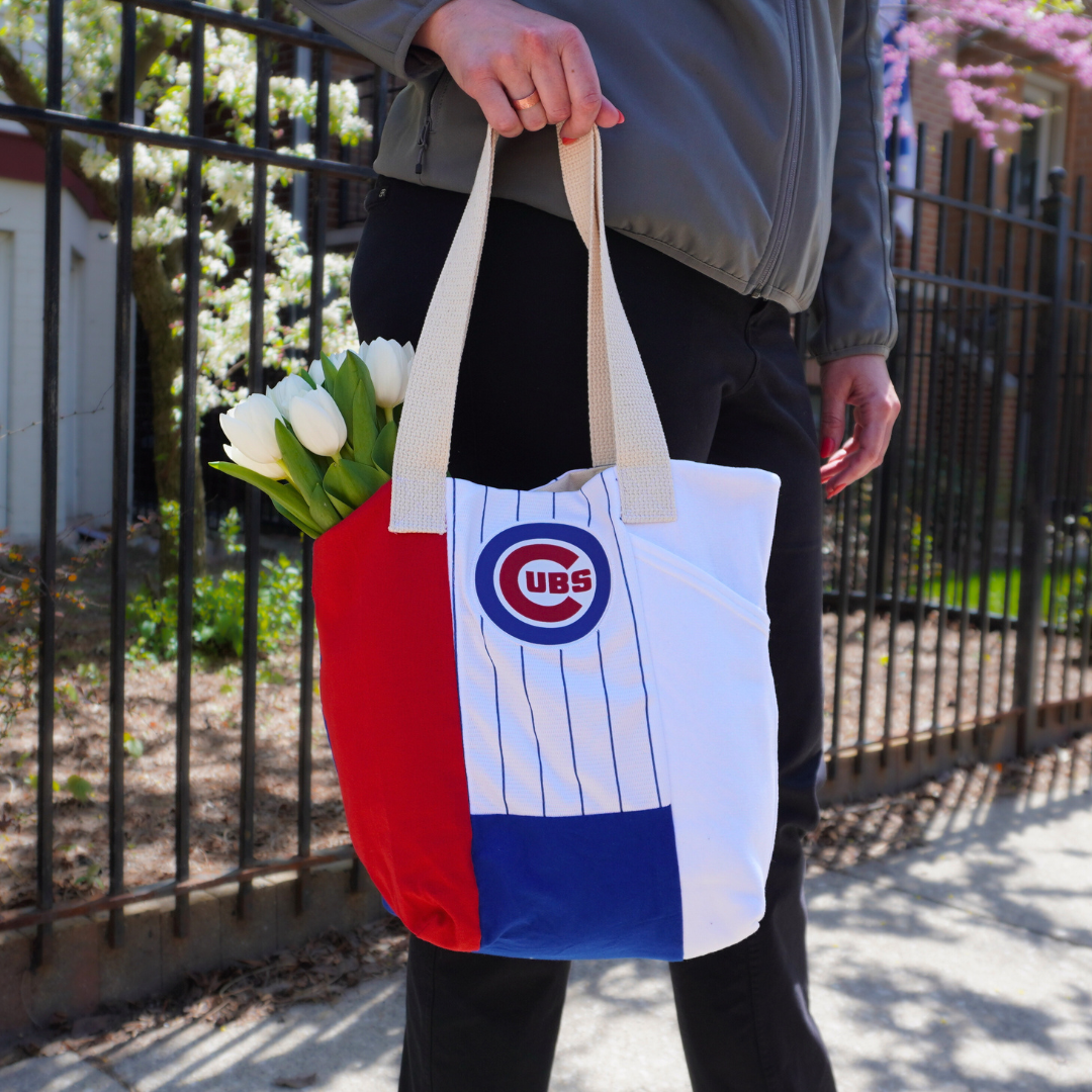 Perfect for active lifestyles and the eco-friendly shopper, this reusable tote bag is made from a variety of materials including recycled Cubs jerseys. Display your passion for the Cubs and the Earth wherever you go with this upcycled tote. Please note that the tote bags pictured here show unique differences of mixed materials and graphics. As with all Refried Apparel products, you will receive a one-of-a-kind tote bag that will vary from the examples shown. .