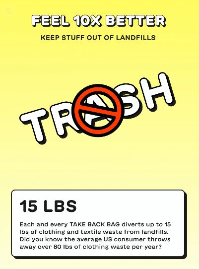 The Take Back Bag aims to launch a circular revolution and eliminate fashion waste. Here's how it works: Get a Take Back Bag, clear out your closet, fill it up, and send it back to Trashie. For each Take Back Bag you order, you'll receive $30 in Ivy Shop credit for your next purchase.