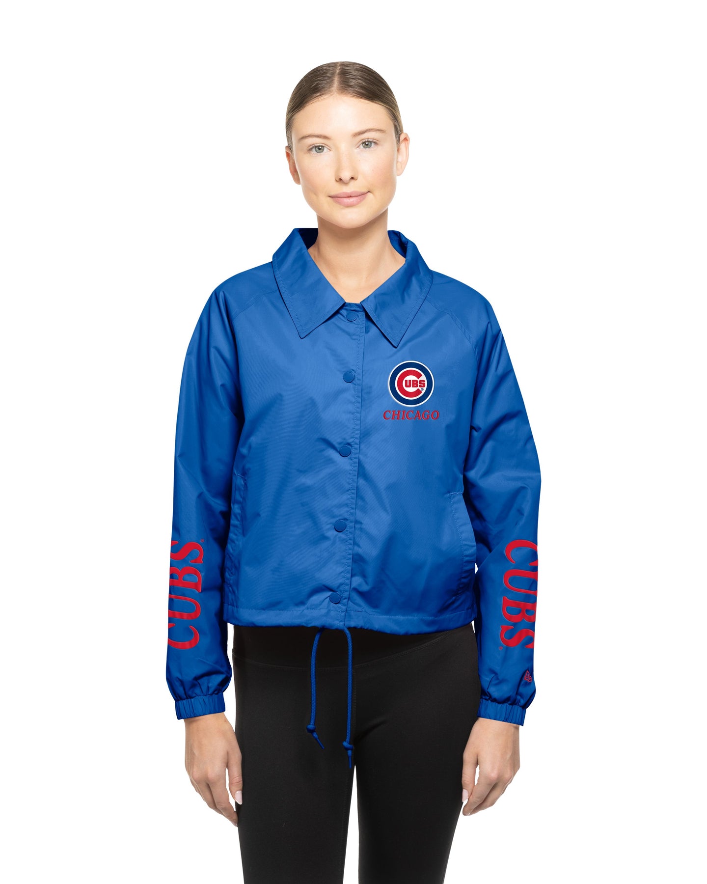 Show your Cubs loyalty with this vibrant royal blue windbreaker, complete with the signature bullseye logo and cubs script adorning the sleeves. The button-down collar and adjustable drawstrings provide a tailored fit that works for game day or casual wear. Officially licensed by New Era, this jacket combines authentic team spirit with practical style you'll reach for all season long.