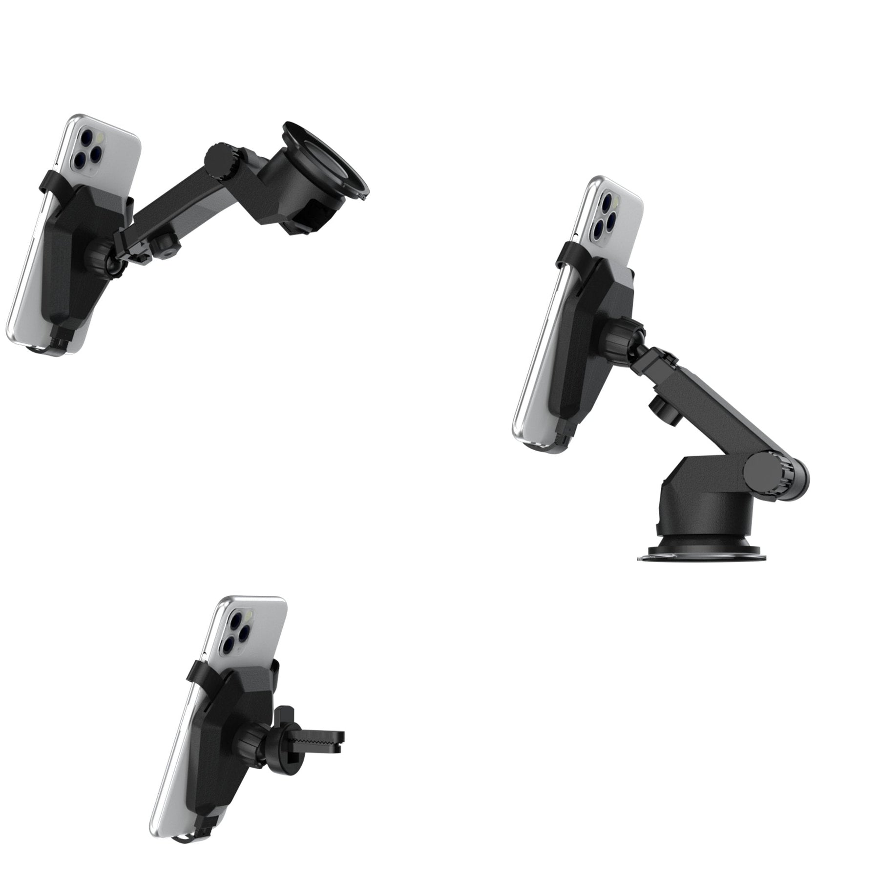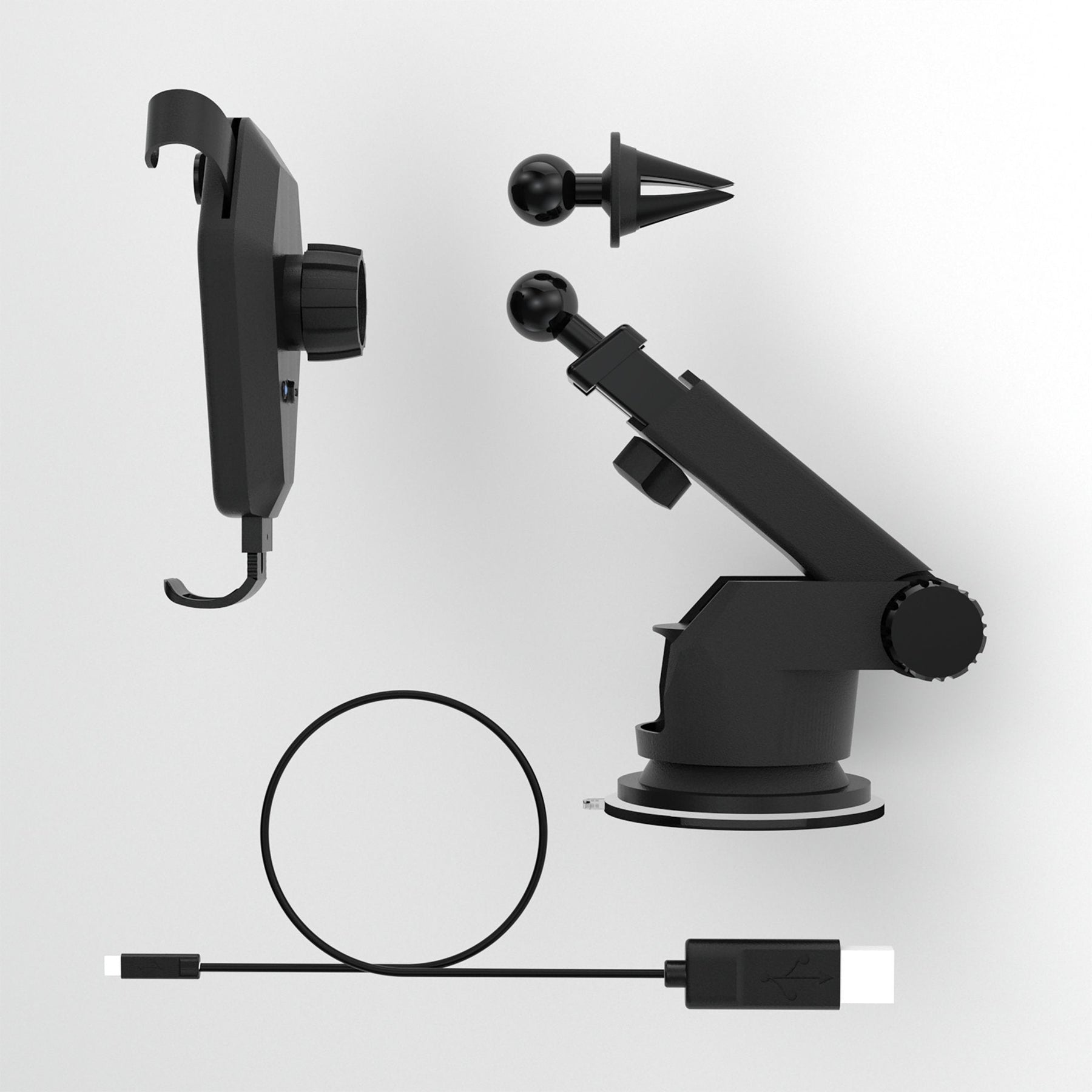 Keep your Qi-enabled device charged with this Wireless Car Charger. Featuring a convenient self-adjusting cradle, quick charge mode, and a charge distance of up to 10mm, this handy charger includes a telescoping suction-mount arm and a low-profile clip mount. These interchangeable options enable limitless placement opportunities. Compatible with Apple, Samsung and other Qi enabled phones. Designed and decorated by Keyscaper in Tualatin, Oregon, USA.